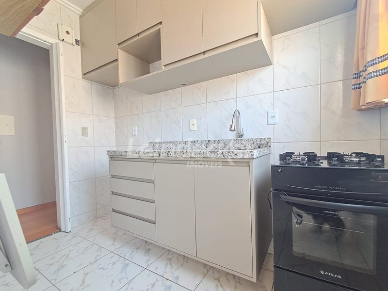 Imóvel mobiliado com estante sofá e mesa. Dormitório com armários, cama e ar condicionado split. Cozinha equipada com armários e fogão a gás. Banheiro social com box de vidro.