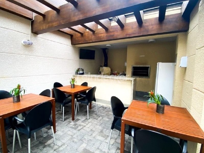 Cozinha com móveis planejados e churrasqueira.