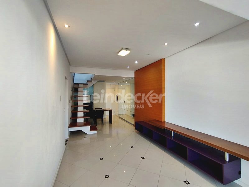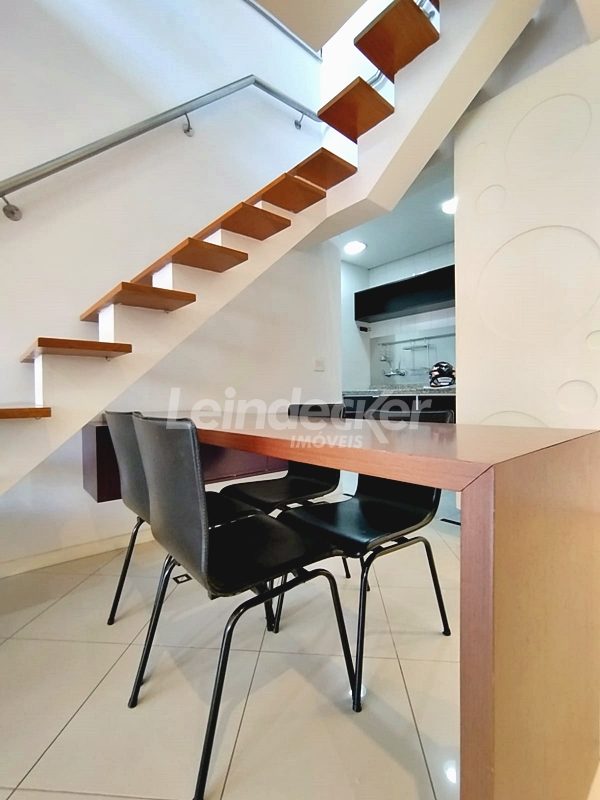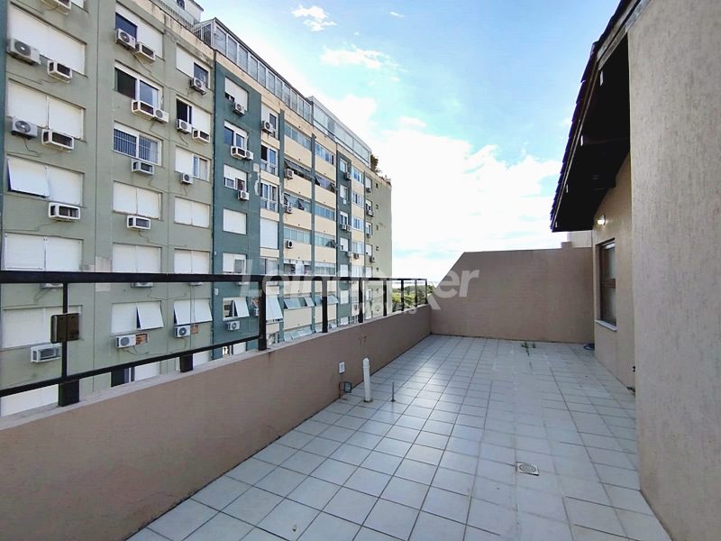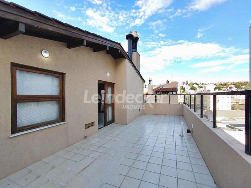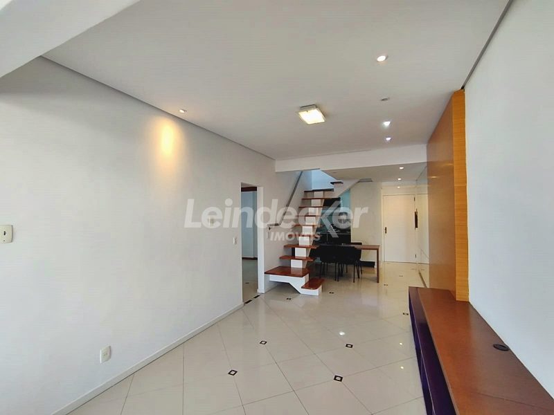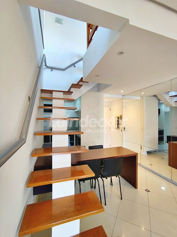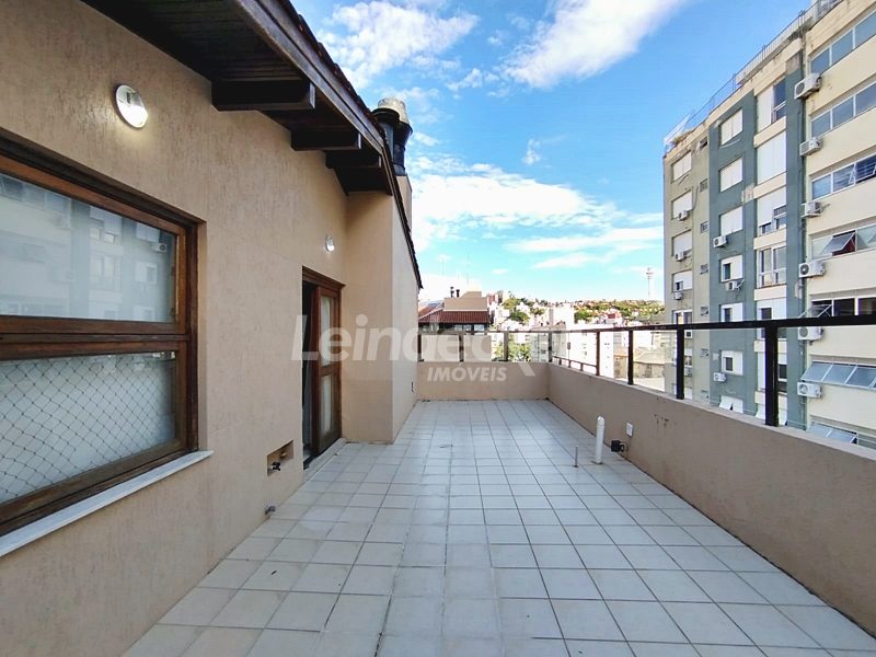 Leindecker Imóveis aluga cobertura semimobiliada com 132m², localizada no bairro Menino Deus, fundos, com vista ampla. Imóvel com 02 dormitórios, amplo living, cozinha com armários, área de serviço, banheiro social, na parte superior amplo living de convivência com churrasqueira, lavabo e terraço aberto com vista, piso laminado nos dois andares. Imóvel com posição solar norte. Possui 02 vagas de garagem descobertas. Localizado em frente à praça da Marinha do Brasil, próximo à academias, bares, restaurantes, supermercados, agências bancárias e escolas. Paradas de ônibus e lotação a poucos metros do imóvel.