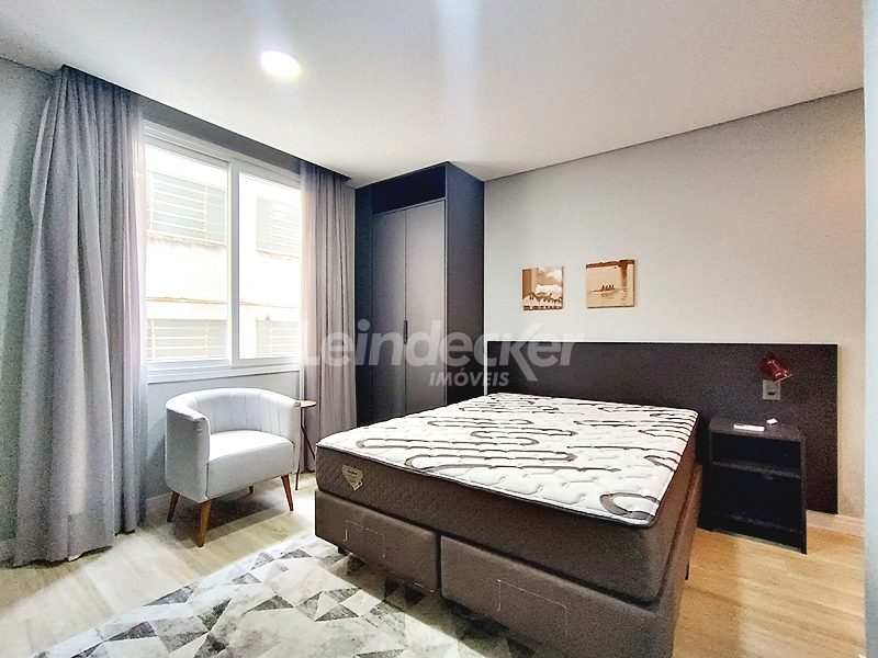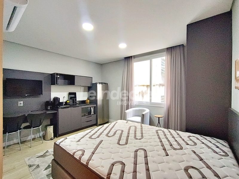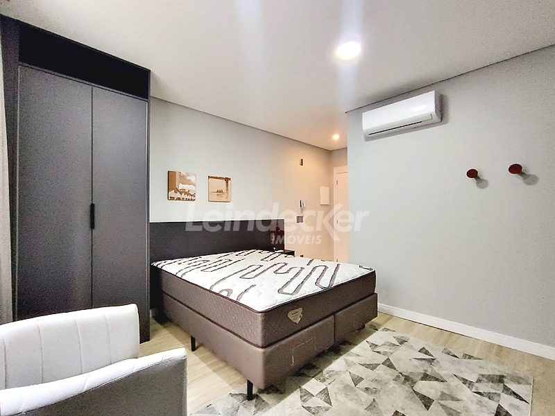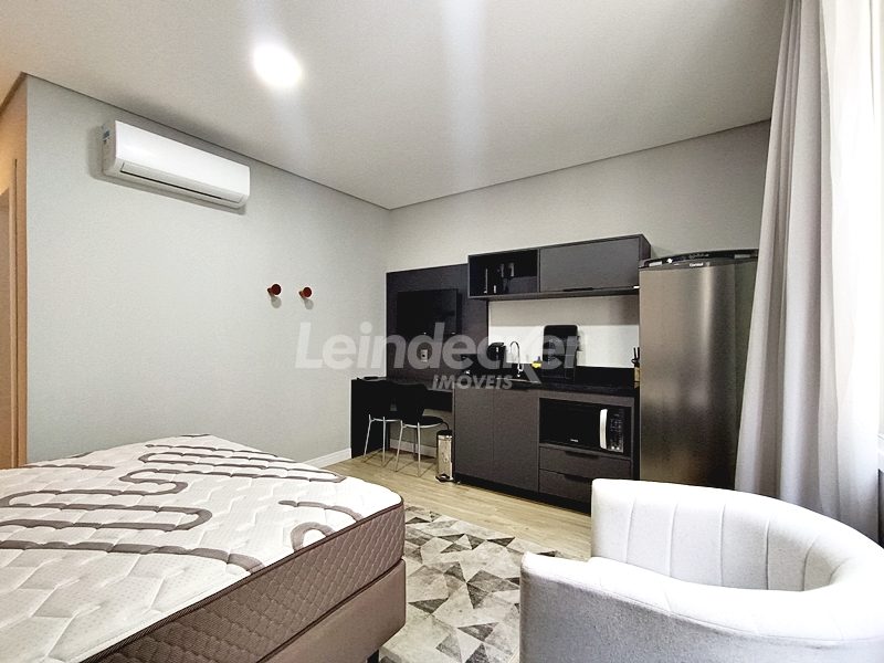 Leindecker Imóveis Aluga Loft mobiliado com 22m², localizado no Centro Histórico, lateral. Imóvel com 1 dormitório com móveis sob medida, ar condicionado split, cozinha completa equipada com cooktop, geladeira, microondas, banheiro social e piso porcelanato. Imóvel com posição solar norte. Condomínio possui piscina no terraço, churrasqueira, salão de festas, lavanderia no prédio, espaço gourmet, elevador, academia de ginástica e portaria 24h. Localizado próximo à academia, bar, restaurante, supermercado, agência bancária e escolas. Paradas de ônibus e lotação a poucos metros do imóvel.