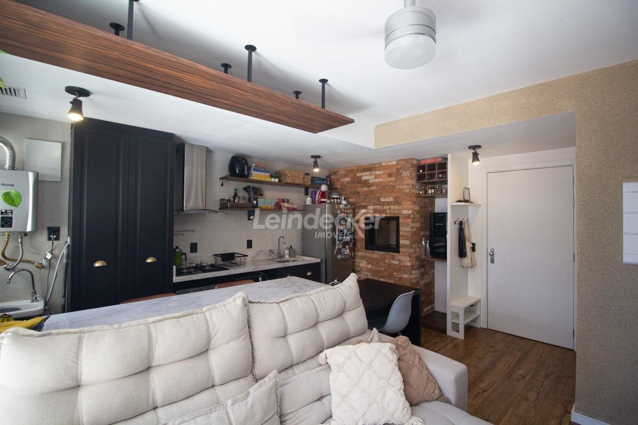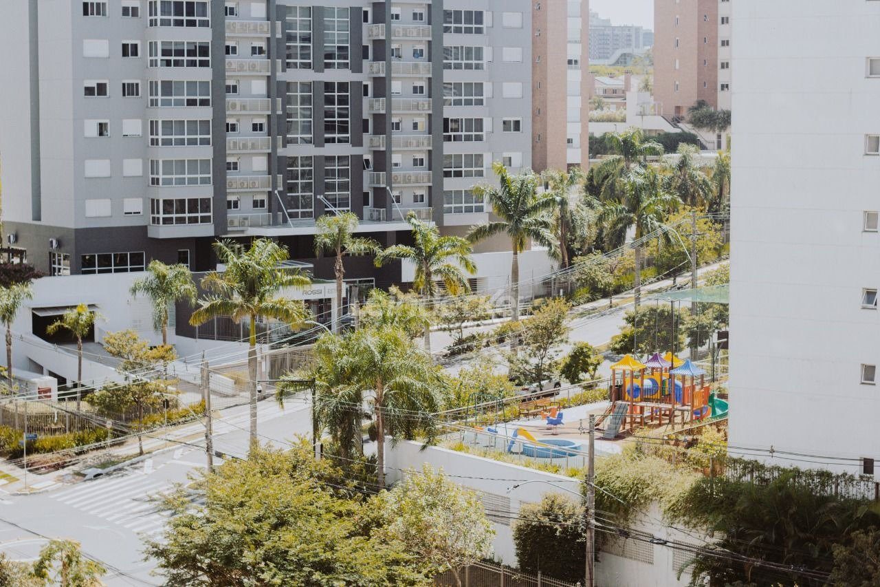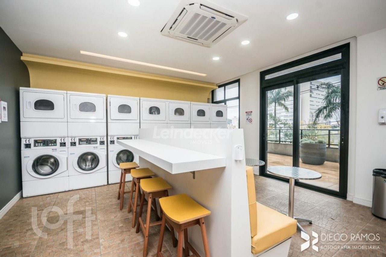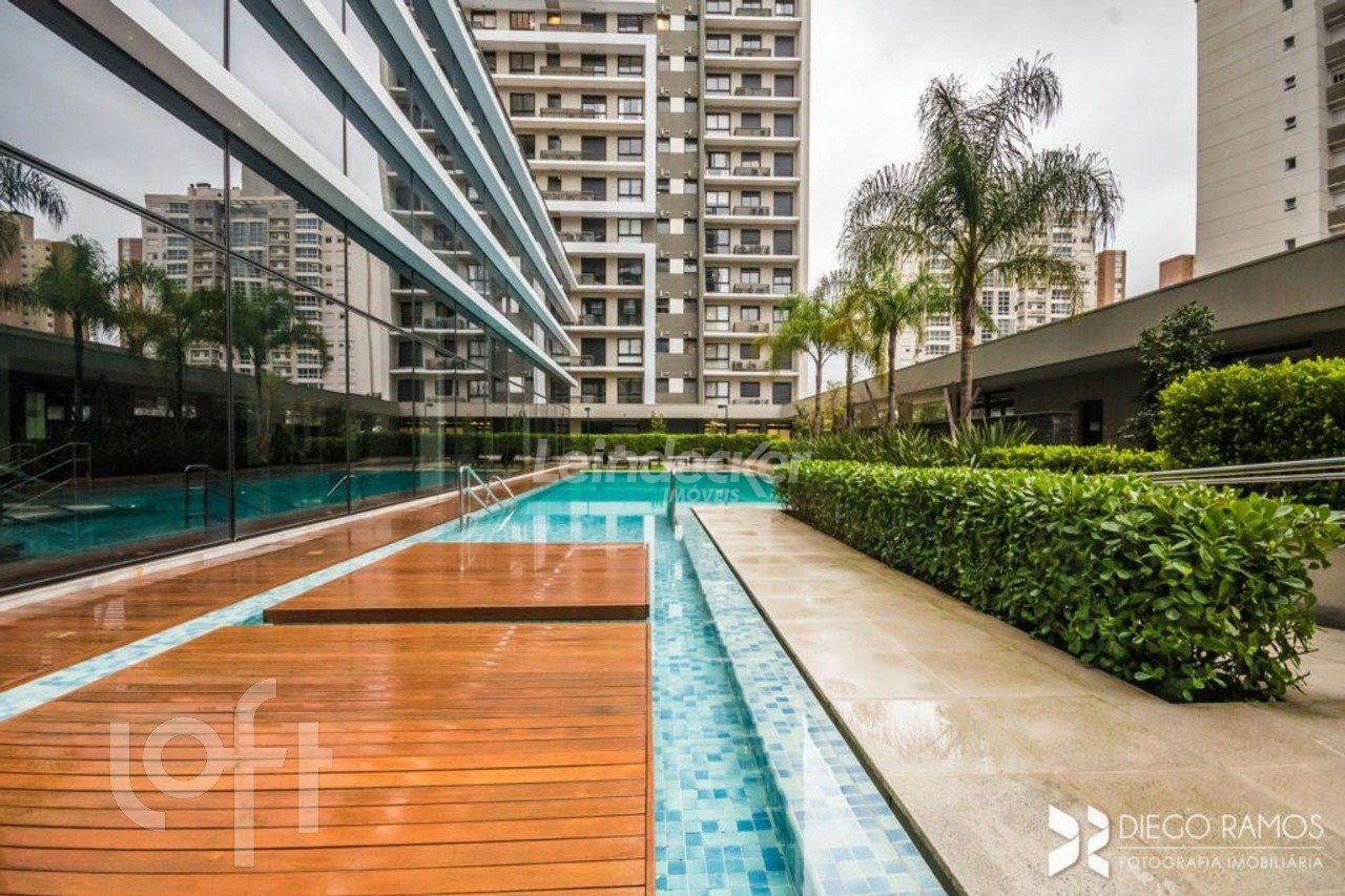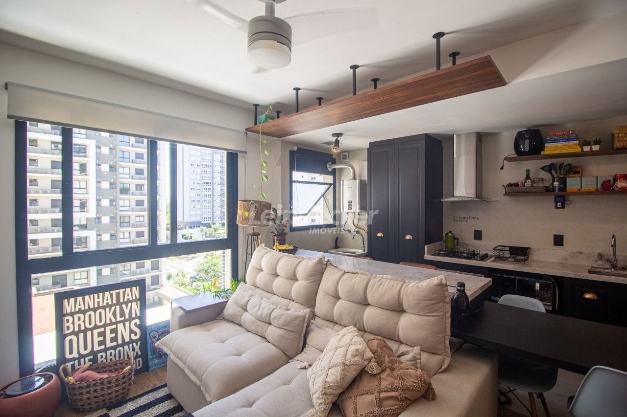 Apartamento de 1 dormitório com 42,48m², sendo suíte, living e cozinha integrados com churrasqueira, ar-condicionado, banheiro social e semi mobiliado com móveis sob medida da marca D'linea. Conta com piso Durafloor, fogão, forno, coifa e bancada em mármore Paraná.