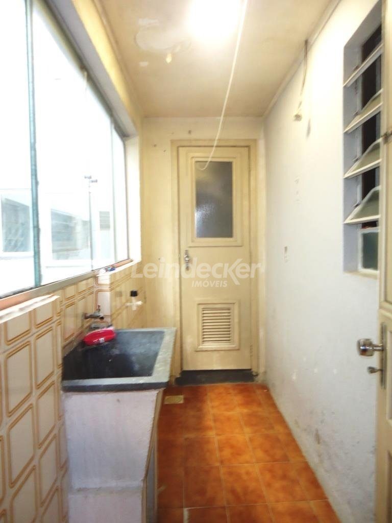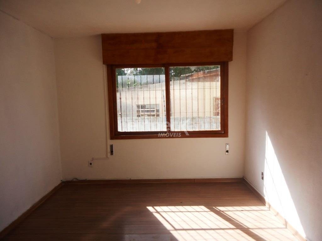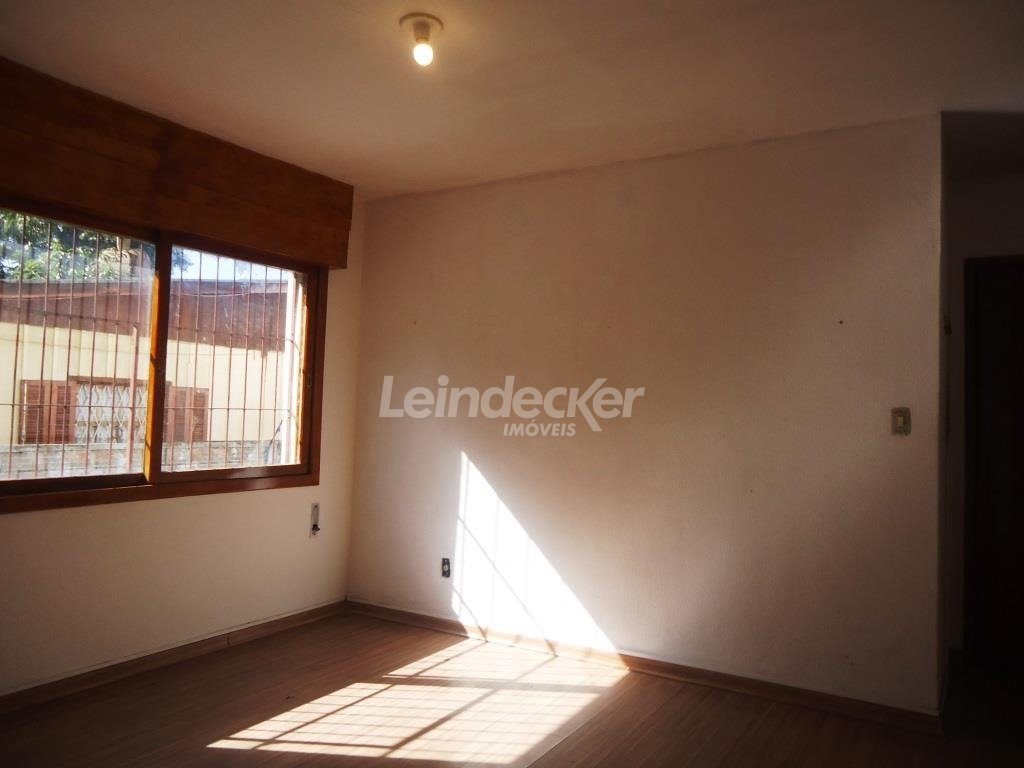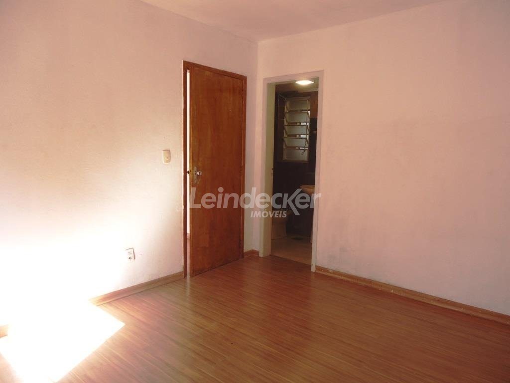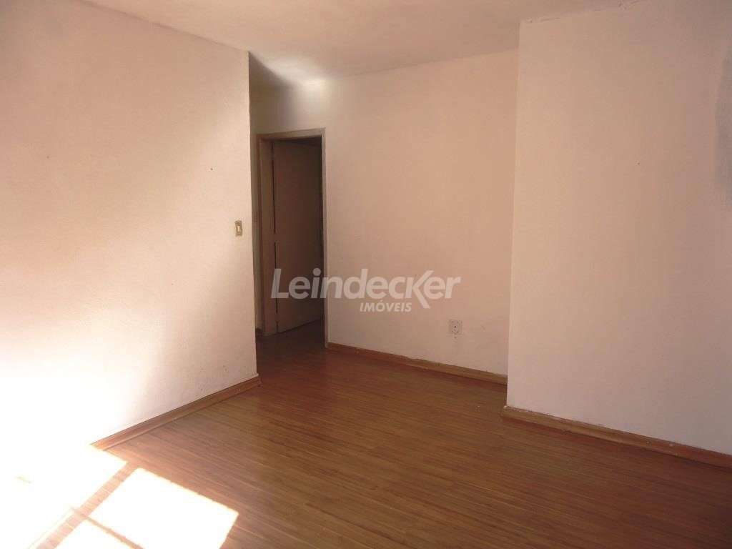 Apartamento com 1 dormitório, banheiro, sala para 2 ambientes, cozinha, área de serviço separada e espera de banheiro auxiliar. Piso laminado e janelas com persianas. Fica no 2º pavimento (um lance de escada).