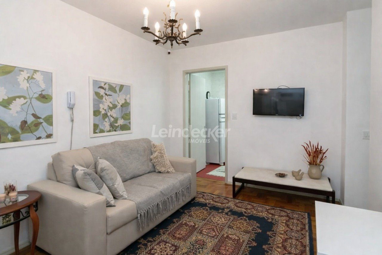 Apartamento térreo, com 3 dormitórios (um deles atualmente transformado em sala de TV/jantar) living; cozinha; banheiro com ventilação natural e duas áreas externas, sendo uma pela sala de estar e a outra pela área de serviço. Conta com janelas antirruído e fica mobiliado.