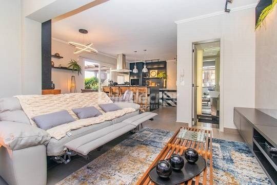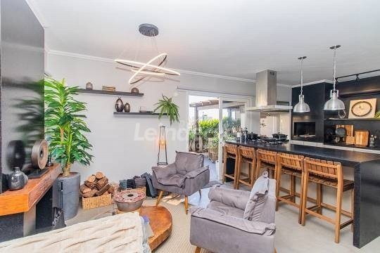No piso superior, sala de estar com lareira e churrasqueira, lavabo, terraço e deck com piscina aquecida.