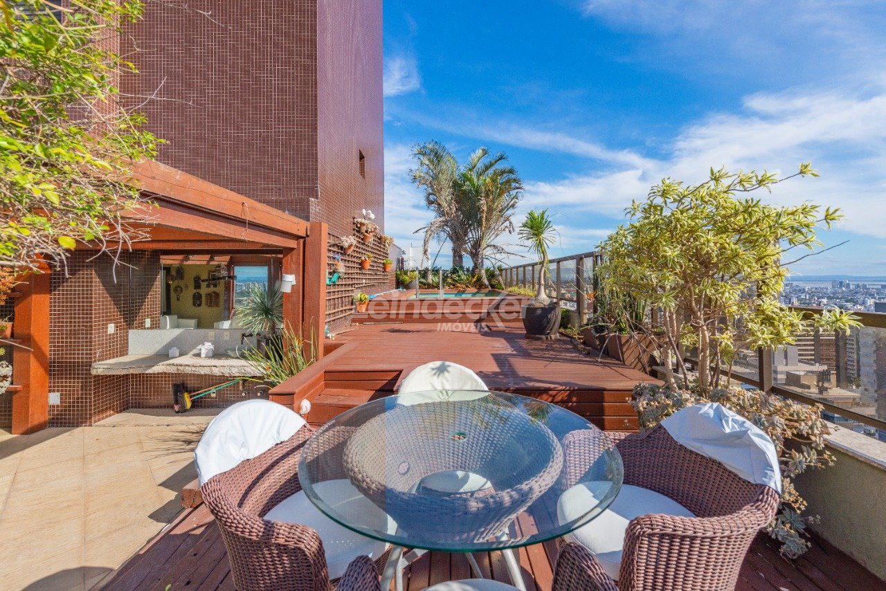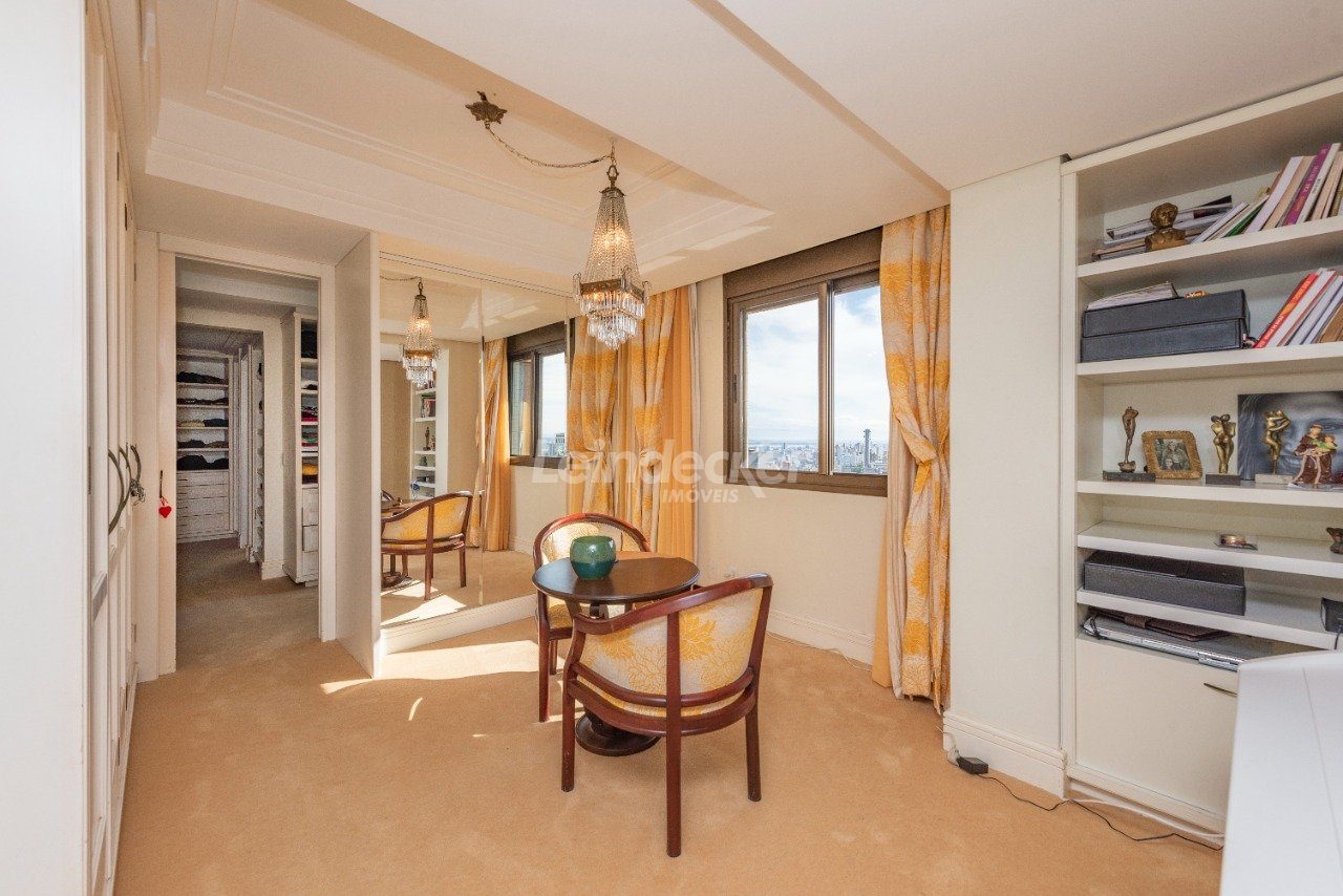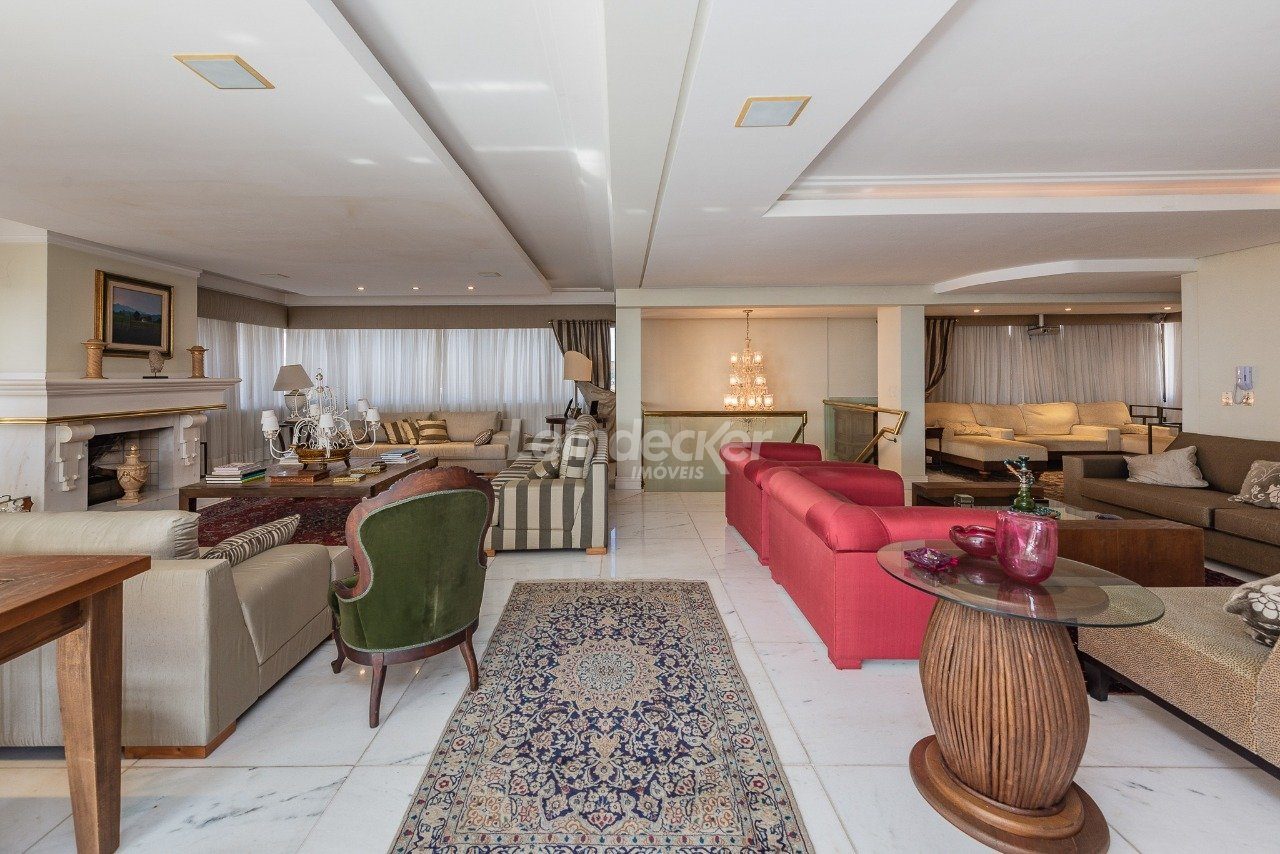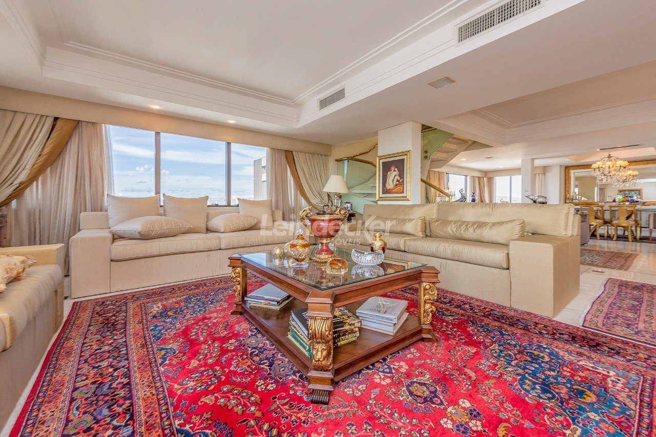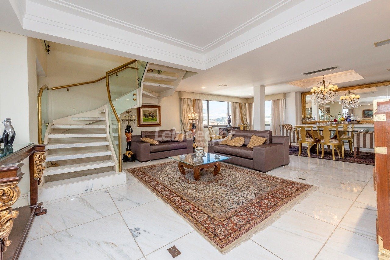 Cobertura em ponto mais alto de porto alegre, com vista de 360º, empresário de mudança para o exterior vende a cobertura com 601m² e requintado acabamento. 03 (três) suítes, sendo uma delas máster com estar íntimo, closet e hidro, com 80m²;Closet em todos os quartos, e as 03(três) suítes podem ser transformadas em 04 (quatro) ou 05(cinco) dormitórios; Armários laqueados com vitrais franceses; 02 (dois) lavabos; Área social com 300m² ;Piso em mármore italiano; Escadarias em mármore e vidro; Rebaixe em gesso e sistema de som em todos ambientes, inclusive banheiros e piscina, ar central quente e frio; Lareira ;Home theater;Copa/cozinha com passa-pratos e piso trabalhado em granito e latão;Lavanderia;Dependência de empregada com banheiro;Portas duplas na entrada dos dois andares com hall decorado;Chapelaria;Tecidos das paredes diretamente da indonésia;02 elevadores codificados que atendem os dois andares da cobertura;Amplo terraço com solarium, pista de dança e piscina sobre deck com batentes de trem;Jardinagem do takeda; 04 (quatro) vagas de garagem;Depósito.Condomínio com infra estrutura de lazer completa, segurança 24hs e vagas para visitantes.Possibilidade de venda com mobília!Valor sob consulta!